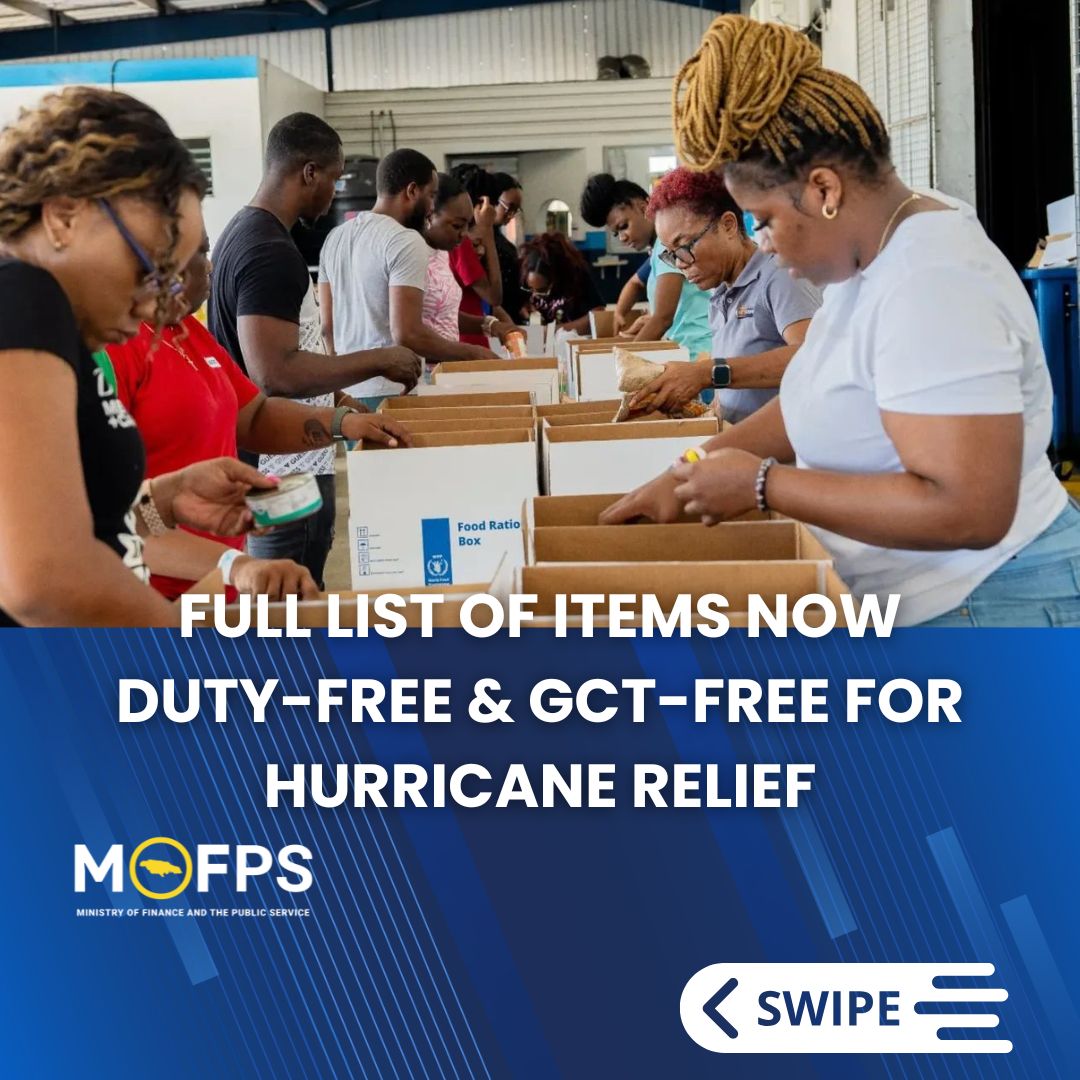 The Ministry of Finance and the Public Service (MOFPS) wishes to advise the public that approval has been granted for an extension in the relief of Import Duty and General Consumption Tax on imported donations and relief supplies to assist in recovery efforts following the passage of Hurricane Melissa.