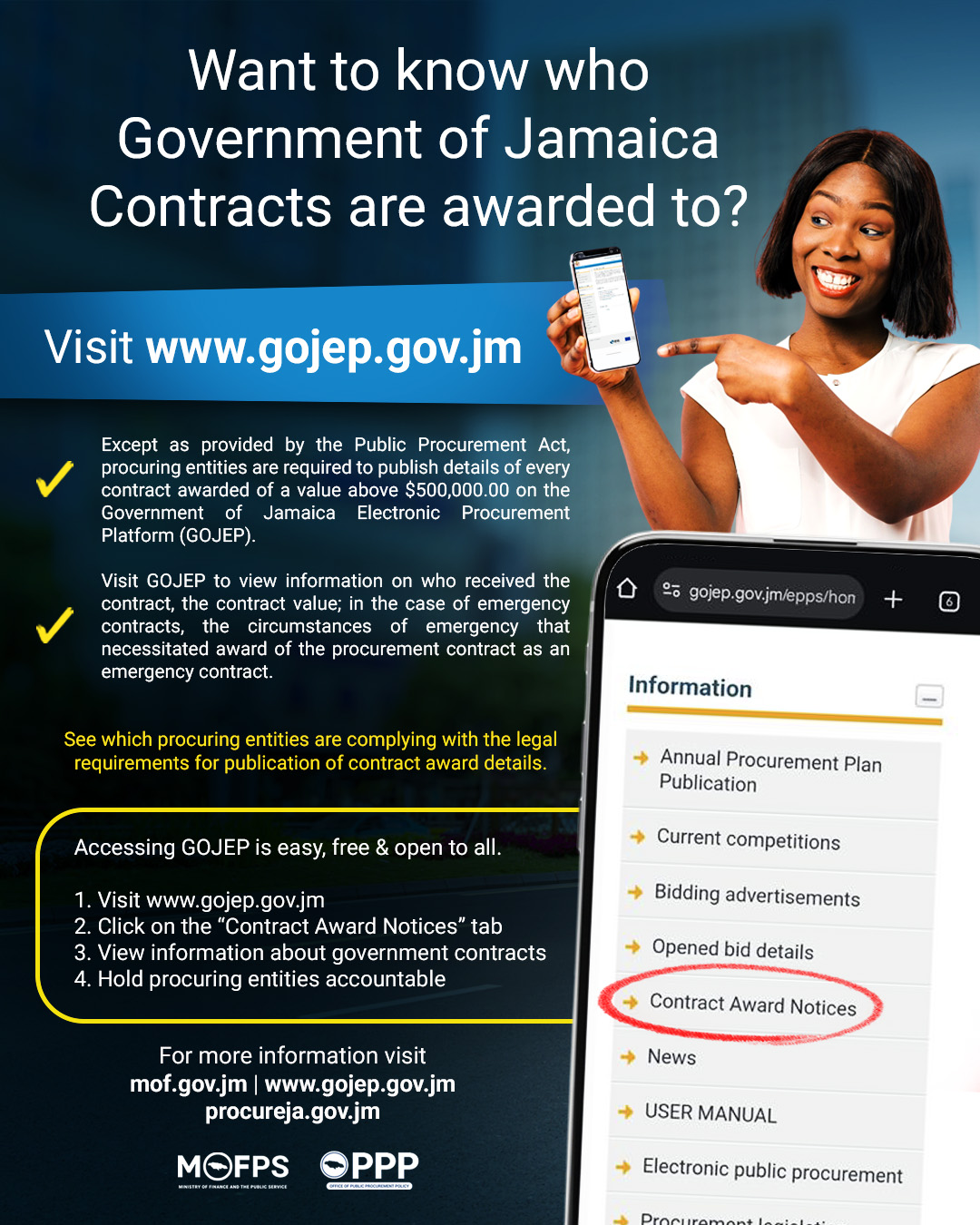 Public procurement, as the Government of Jamaica’s largest commercial activity, falls under the responsibility of the Minister of Finance, who oversees public expenditure and financial management. Under the Public Procurement Act, 2015 and its Regulations, the Minister advances fiscal and economic policy objectives through a strong procurement policy framework.